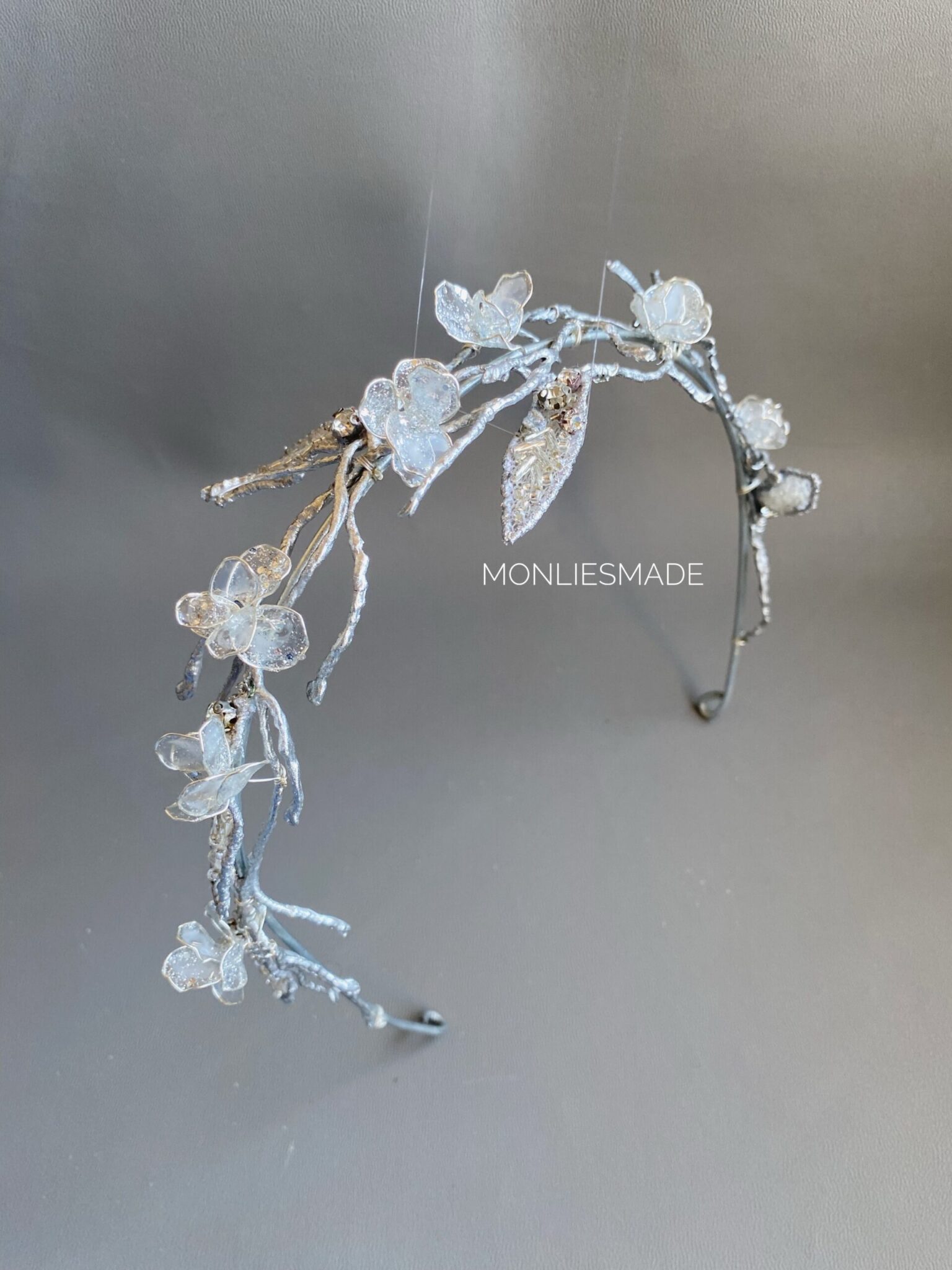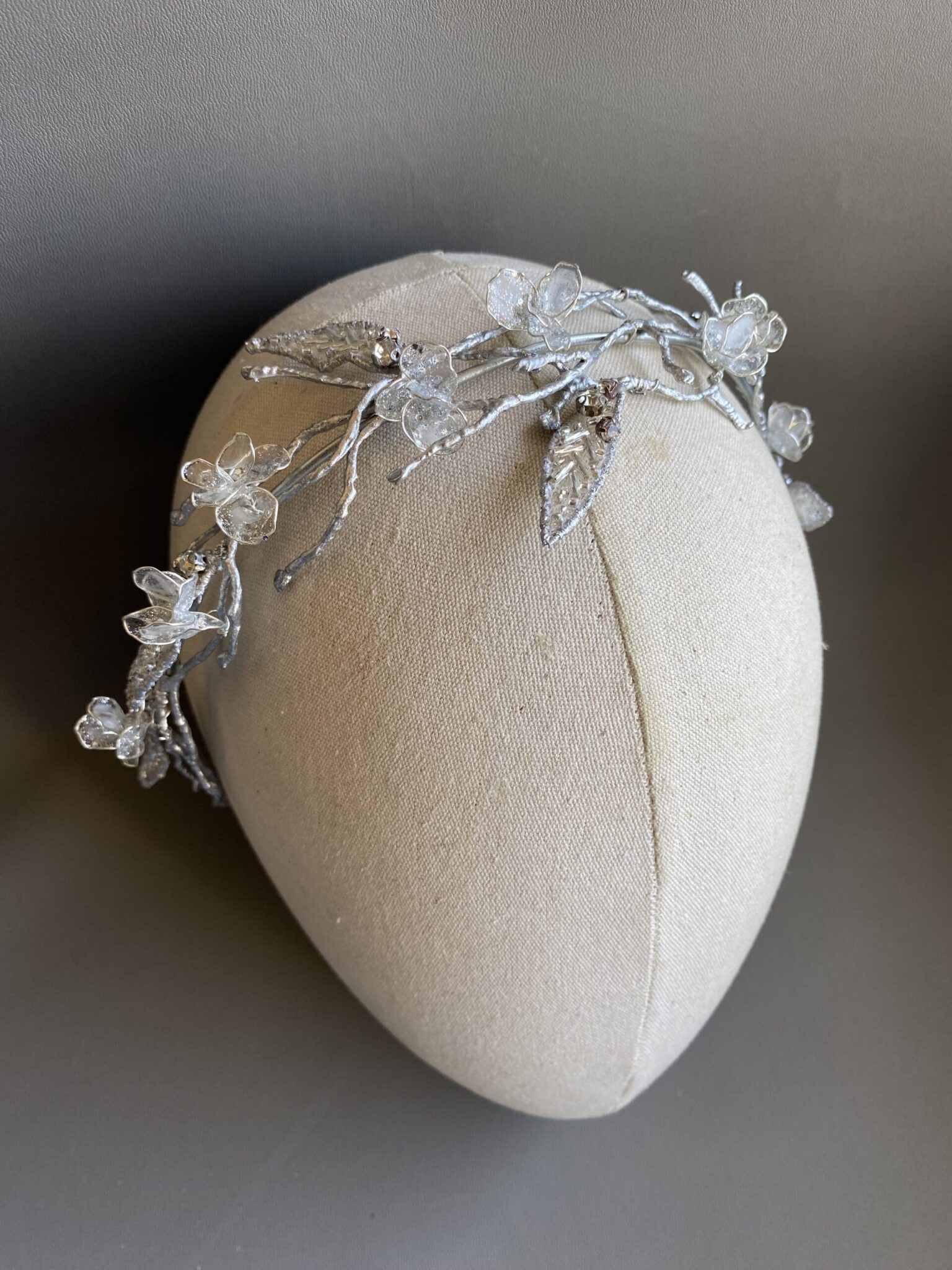 Featuring all materials, this nature-inspired haircut is perfect as a wedding hair accessory for the bride herself, or other relatives. Diamond embellishments add an extra feminine touch to the whole look.