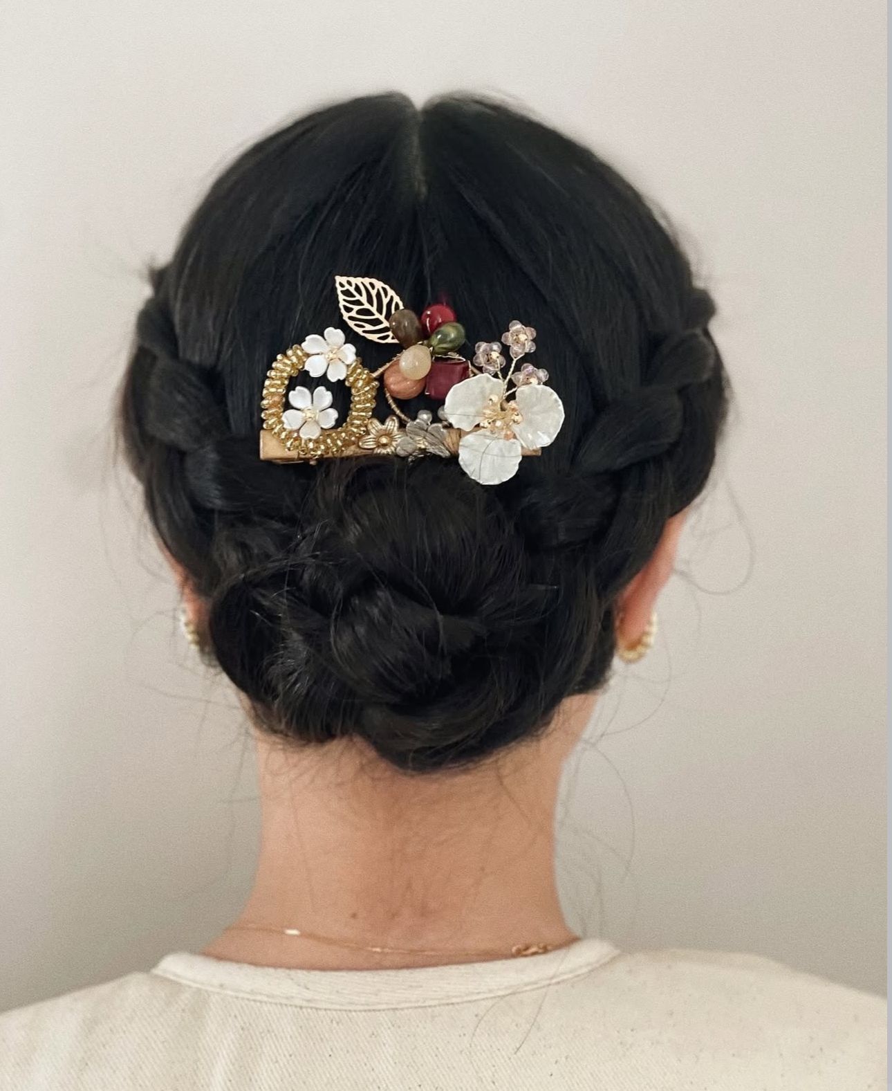 Featuring all materials, this nature-inspired haircut is perfect as a wedding hair accessory for the bride herself, or other relatives. Diamond embellishments add an extra feminine touch to the whole look.